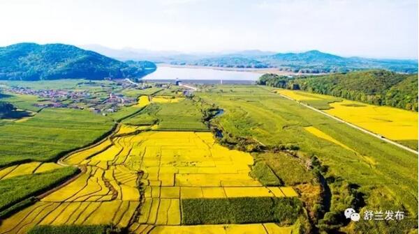 丰富而又纯净的水源是“舒兰大米”品质的保障。图为舒兰新安水库和库区稻田