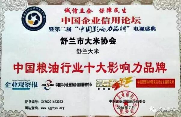 “舒兰大米”先后获得中国地理标志证明商标、中国农产品地标保护产品、中国粮油行业十大影响力品牌、吉林省著名商标,目前正在申请国家驰名商标。